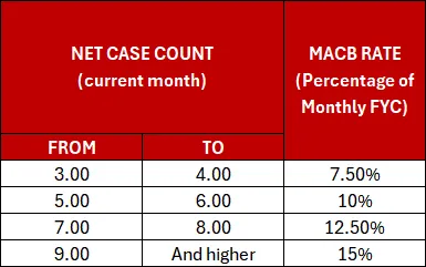 4. MACB Computation - The MACB is computed monthly by multiplying an agent's or agency leader's personal First Year Commissions (FYC) paid for the month by the applicable MACB rate. The MACB rate is dependent on the agent's or agency leader's Net Case Count for the month,